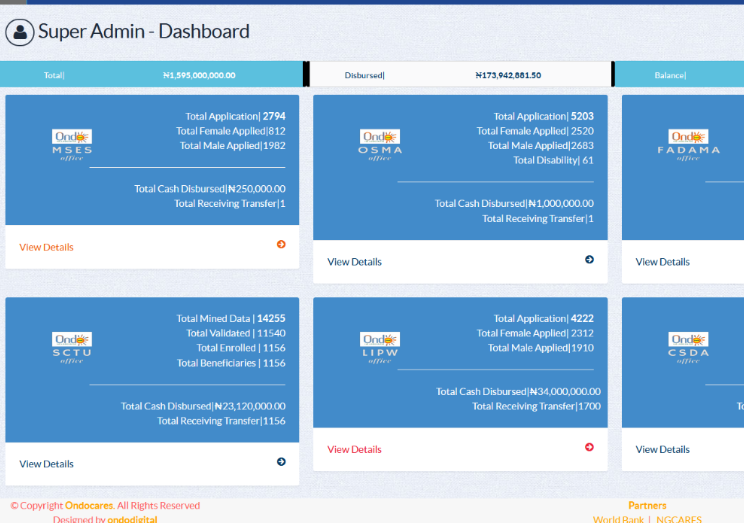 Ondocares is a web application with both a public website and an administrative dashboard. It monitors and reports on the disbursement of COVID-19 relief packages in Ondo State, Nigeria, through a program called OD-CARES (Ondo State COVID-19 Action Recovery and Economic Stimulus). Ondocares oversees and tracks the distribution of economic stimulus and social welfare programs funded by the World Bank across different constituencies in Ondo State, providing transparency and accountability around COVID-19 relief spending. The website provides public information, while the dashboard enables administrative reporting and accountability.